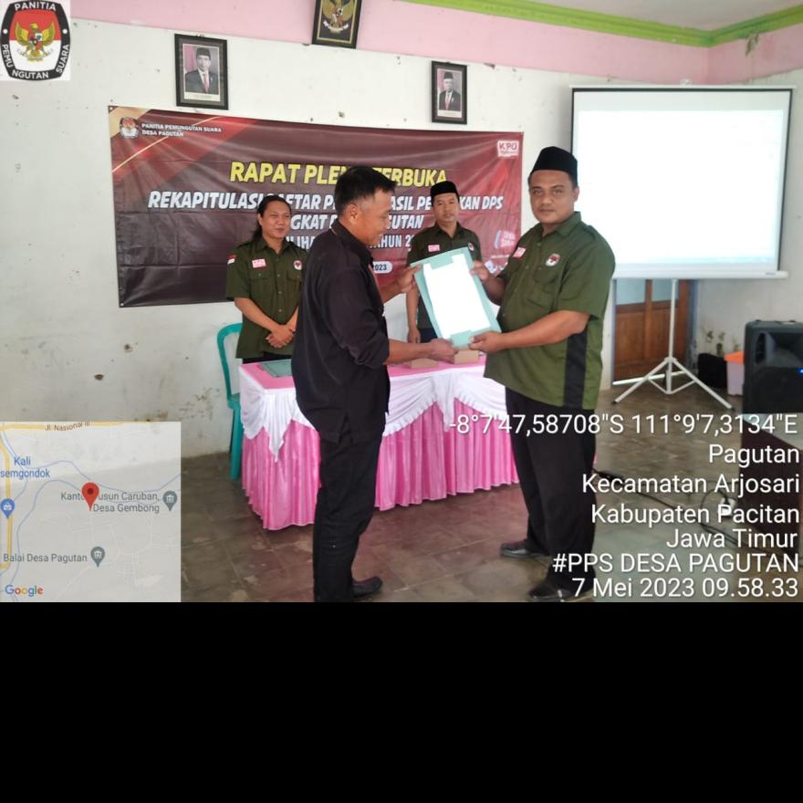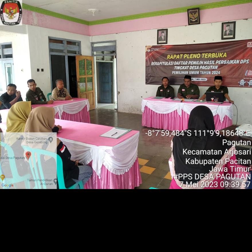 Minggu, 7 Mei 2023 Panitia Pemungutan Suara (PPS) Desa Pagutan pada Pemilu Tahun 2024 masuk pada tahapan pelaksanaan Rapat Pleno Terbuka Rekapitulasi Pemilih Hasil Perbaikan DPS. Rapat yang diselenggarakan di Balai Desa Pagutan Kecamatan Arjosari Kabupaten Pacitan tersebut dihadiri oleh PPS dan Sekretariat PPS Desa Pagutan, Unsur Pemerintah Desa Pagutan, PKD Desa Pagutan, Parpol, PPK Kecamatan Arjosari, Panwascam Arjosari, dan undangan lainya. " Sebagaimana jadwal yang sudah diberikan oleh PPK Kecamatan Arjosari, hari ini kami mengundang beberapa unsur terkait untuk Penetapan Rekapitulasi Pemilih Hasil Perbaikan DPS", demikian diungkapkan oleh Andy Kumala Sakti dari divisi Data PPS Desa Pagutan.